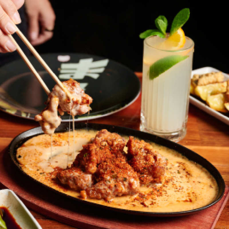 Karaage chicked served on a sizzling cast-iron plate topped with kimchi cheese sauce and shichimichi at your table.